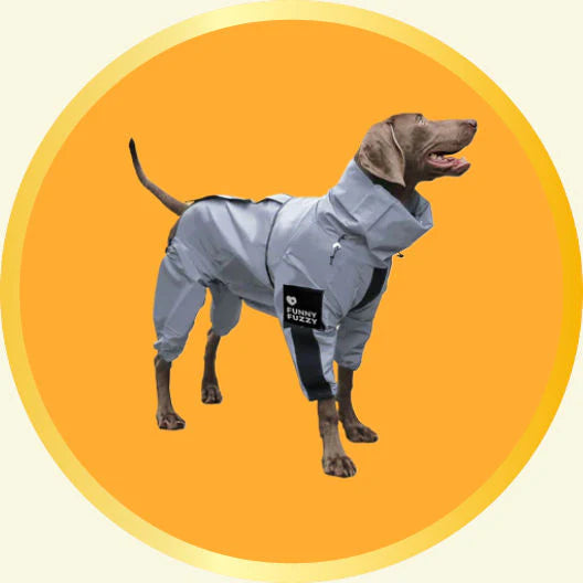 This suit is so easy to put on my dog. Great material which keeps my by warm and dry.
