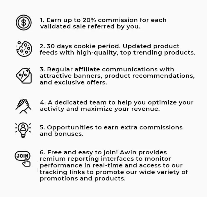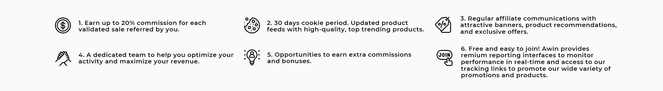 We work with Awin to facilitate our tracking, reporting, and payment. Awin provides you with tracking to add to your site. When a visitor clicks the affiliate link on your site and makes a purchase, Awin records that order. Awin then grants you commissions on all customer orders that occur within your cookie window.