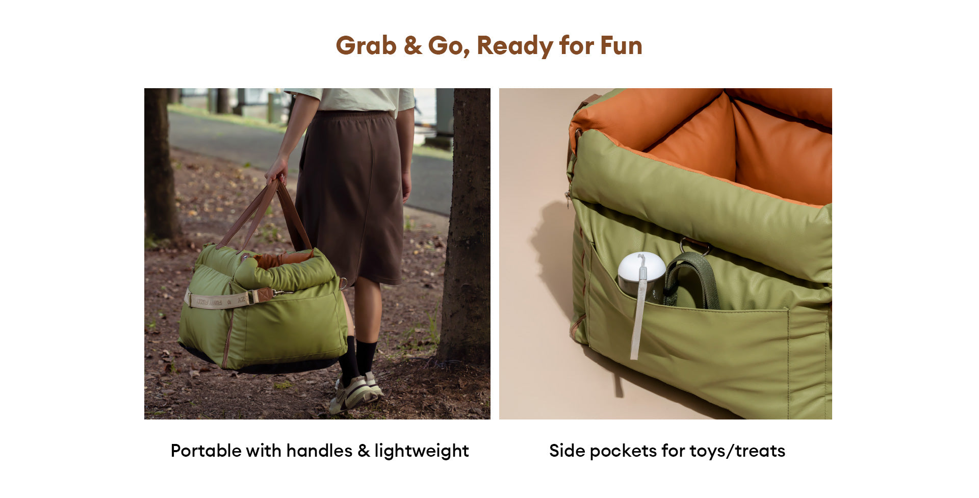 - Practical & Portable: The broad, leather-reinforced handle is designed for ease of transport, reducing the strain of carrying, while the side pockets are perfect for storing essentials like toys and snacks. Perfect for small to medium-sized dogs.